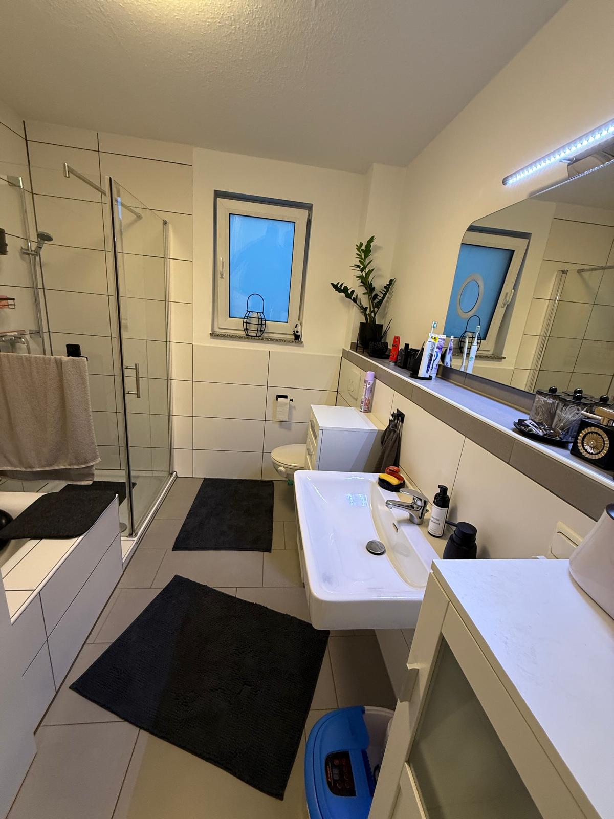 Das moderne Badezimmer ist komfortabel mit Badewanne und separater Dusche ausgestattet. Ein Balkon erweitert den Wohnraum nach außen und bietet einen angenehmen Rückzugsort.